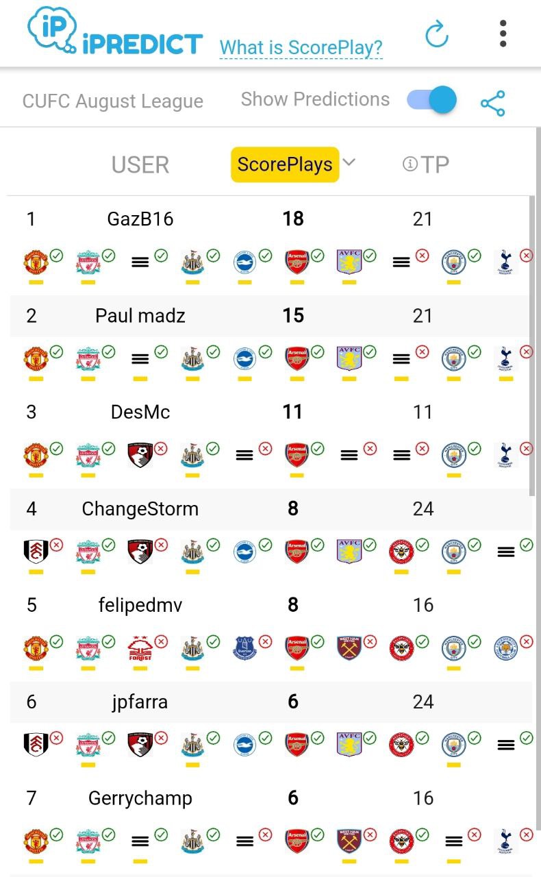 For example, GazB16 is currently leading the standings in the image provided. You can easily see the outcomes of each game they have predicted. A yellow line beneath the prediction indicates that the user ScorePlayed that match, such as Gaz predicting a Manchester United win. After the matches are locked, you'll be able to see everyone’s predictions and whether they ScorePlayed that particular game.
